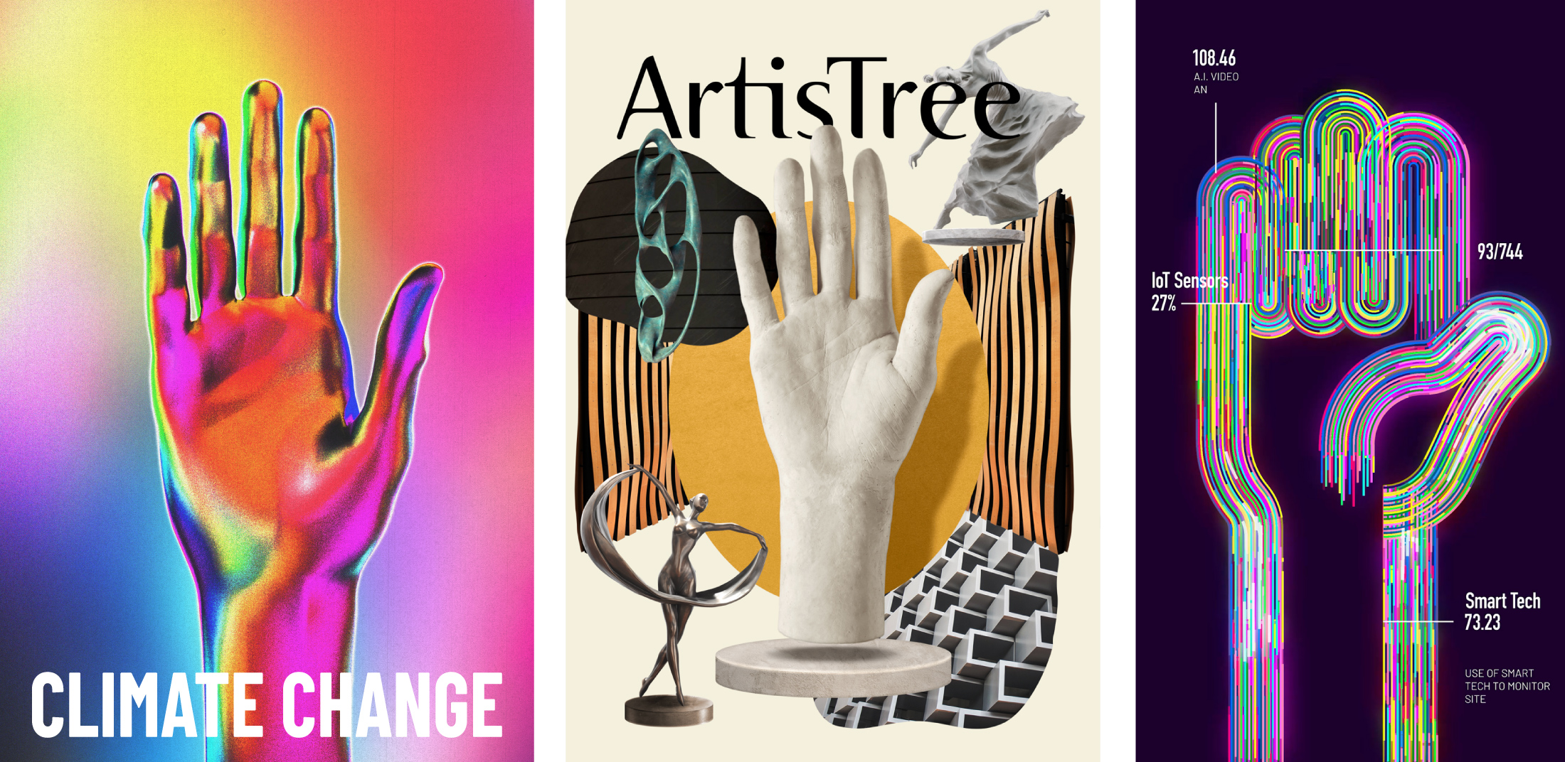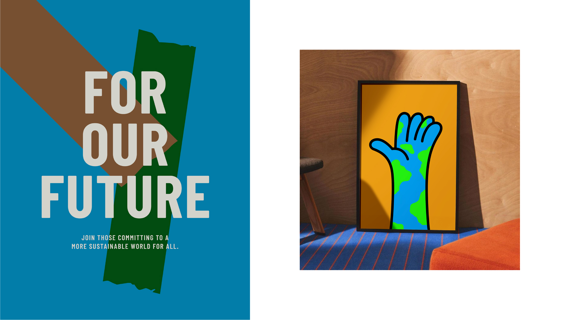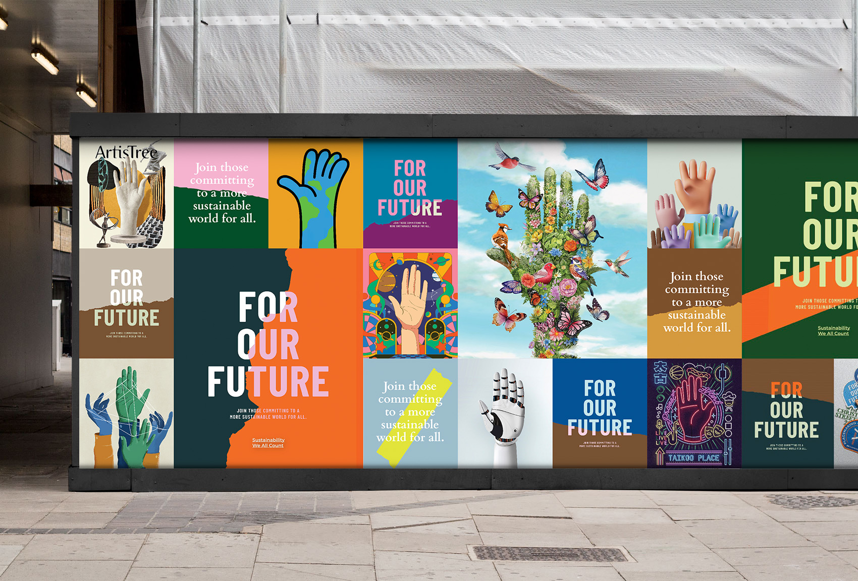Create a tapestry of hands each representing a firm commitment FOR OUR FUTURE, a sustainability campaign.